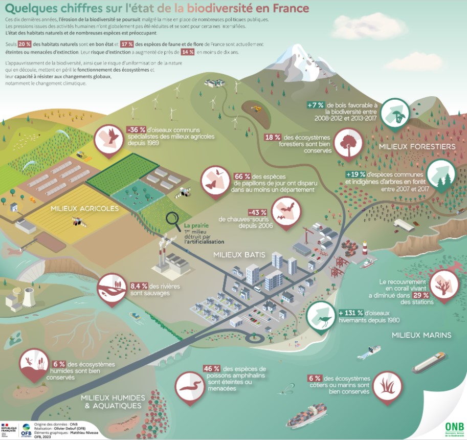 Depuis 2013, l’Observatoire national de la biodiversité (ONB) met à disposition de tous des informations fiables et régulièrement actualisées sur l’état et la dynamique de la biodiversité en France, les pressions auxquelles elle est confrontée et les réponses que la société y apporte. Quels constats peut-on dresser en 2023 à partir des indicateurs publiés par l’ONB ? Comment la biodiversité et les menaces qui pèsent sur elle ont-elles évolué ces dix dernières années sur le territoire ?